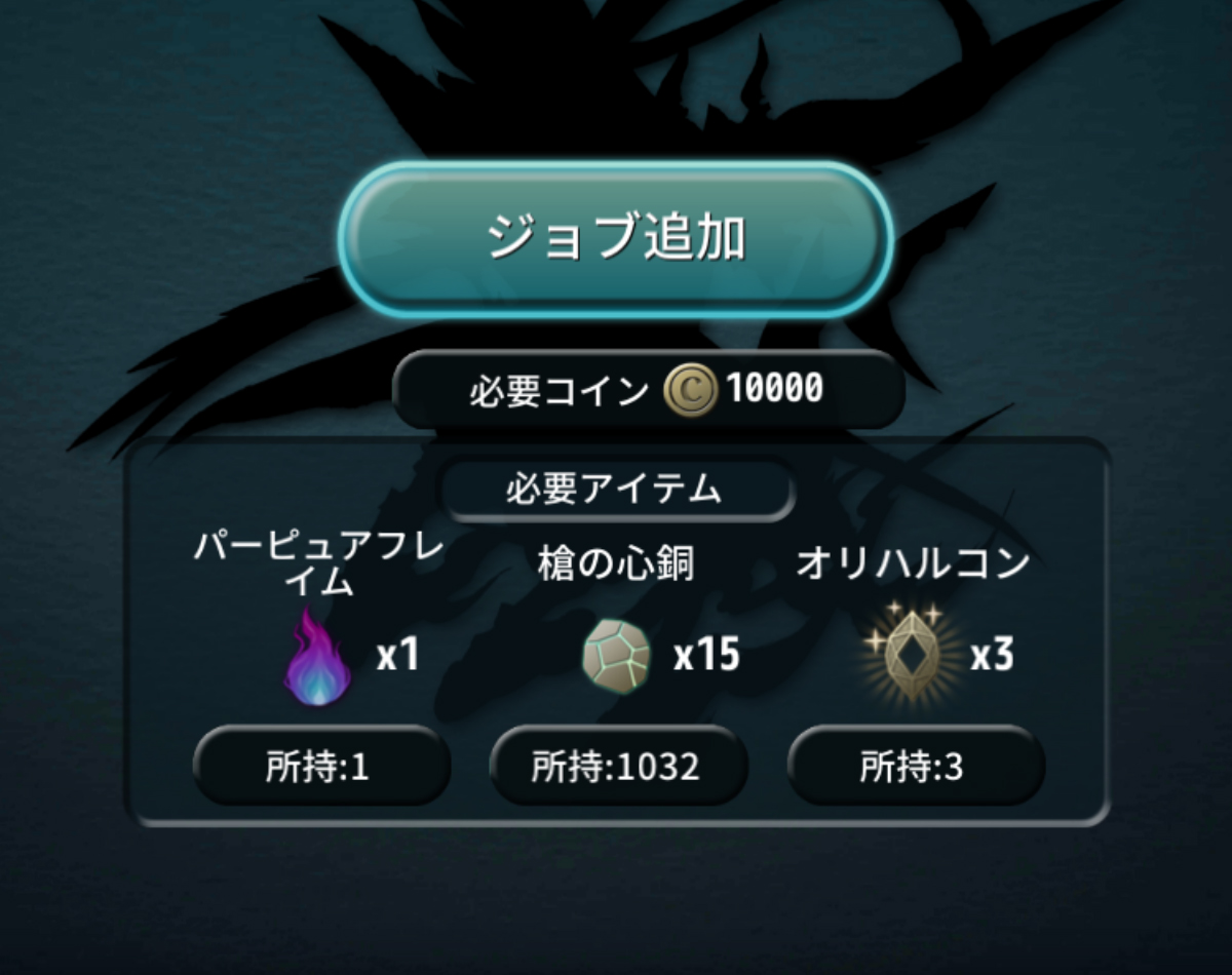 - ジョブ2の開放にレア・アイテムの【オリハルコン】が3個ずつ必要
